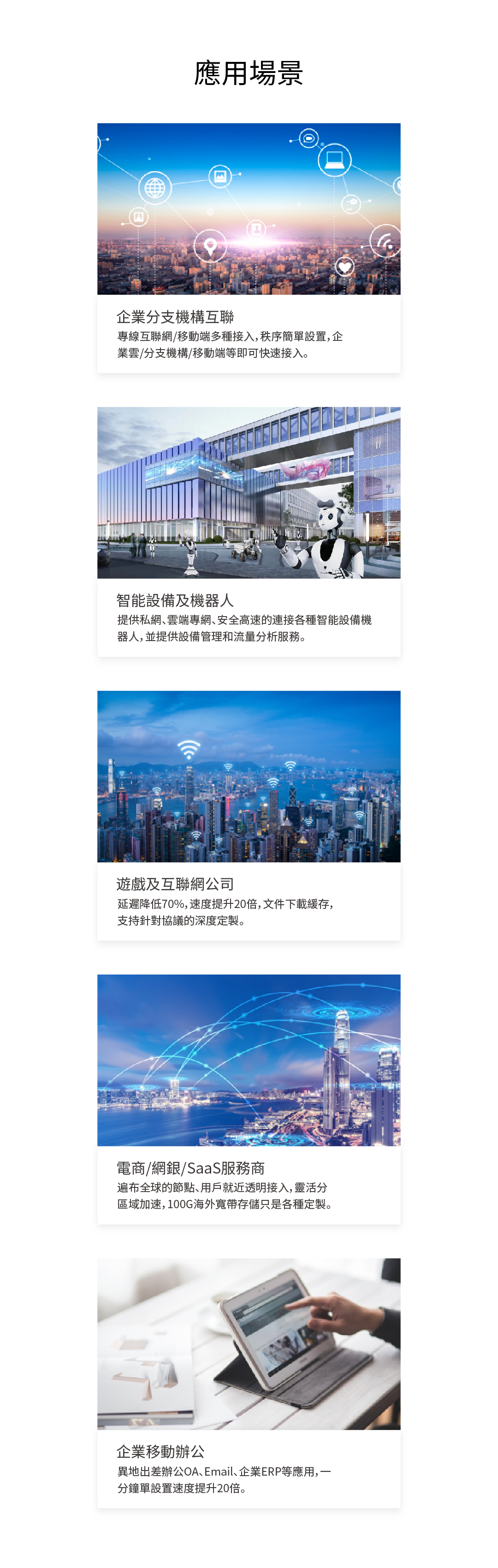 智能設(shè)備及機(jī)器人 提供私網(wǎng)、雲(yún)端專網(wǎng)、安全高速的連接各種智能設(shè)備機(jī)器人,並提供設(shè)備管理和流量分析服務(wù)。