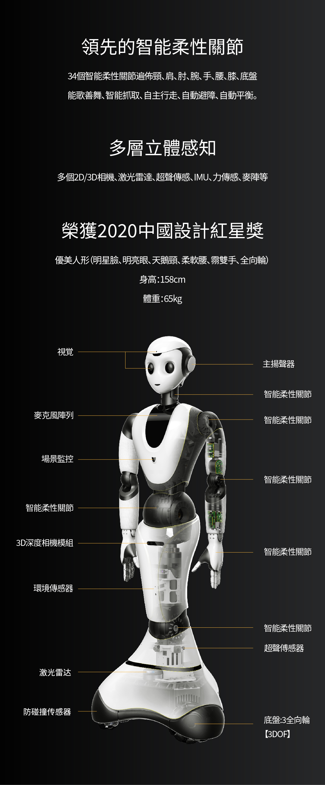 34個智能柔性關(guān)節(jié)遍布頸、肩、肘、腕、手、腰、膝、底盤