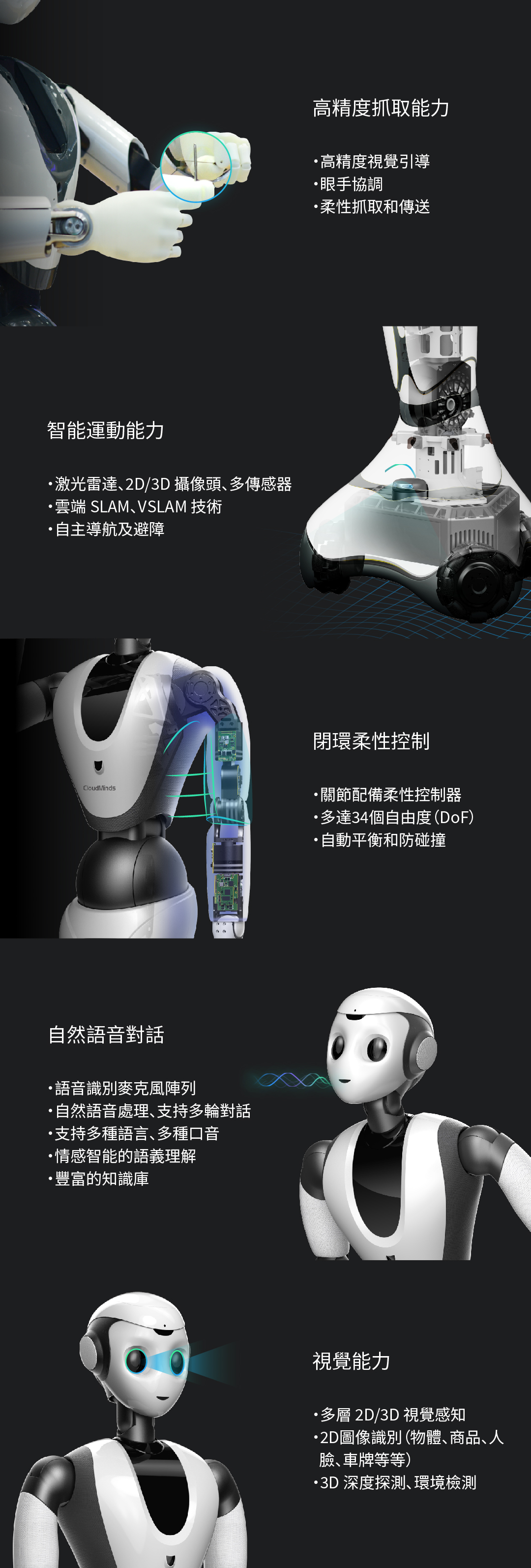 精準(zhǔn)的視覺抓取能力、全方位的聽、說、看、動等融合智能能力。