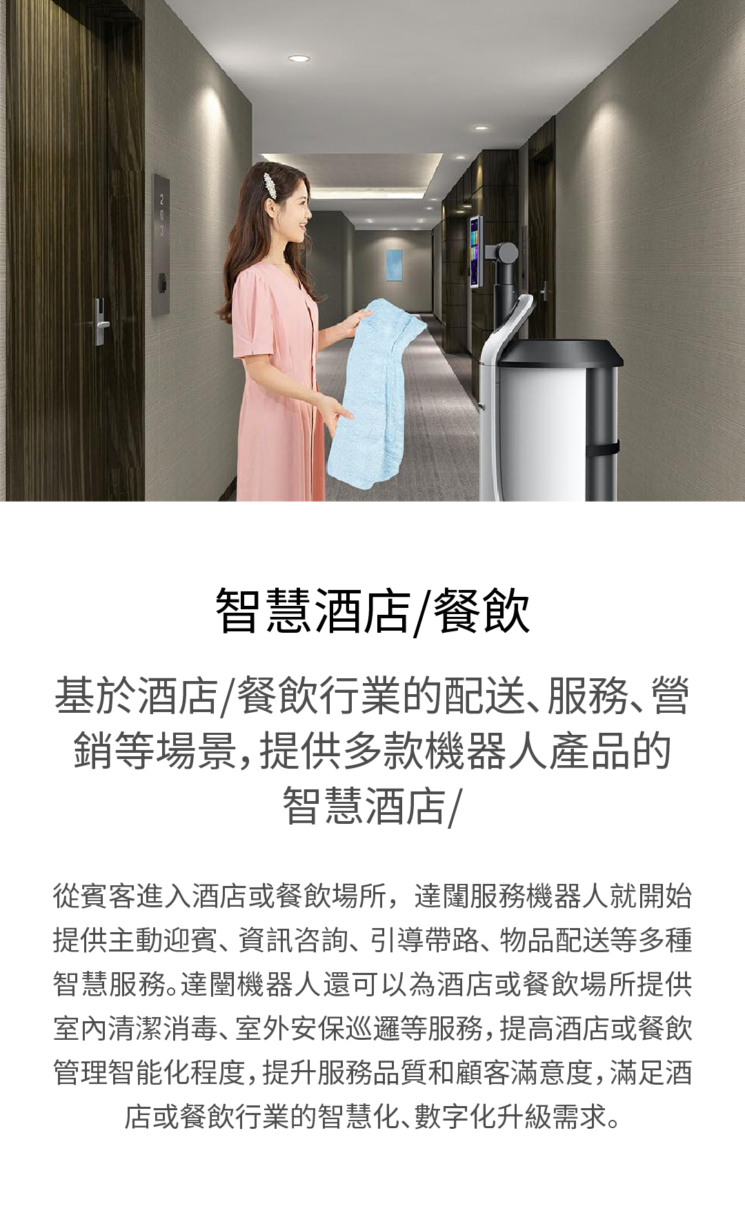 基於酒店/餐飲行業(yè)的配送、服務、營銷等場景,提供多款機器人產(chǎn)品的智慧酒店/