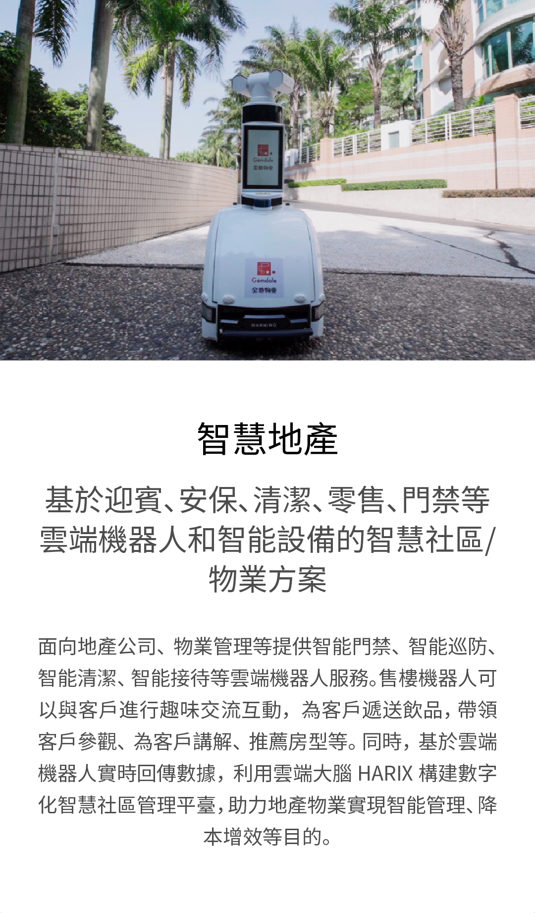 面向地產(chǎn)公司、物業(yè)管理等提供智能門禁、智能巡防、智能清潔、智能接待等雲(yún)端