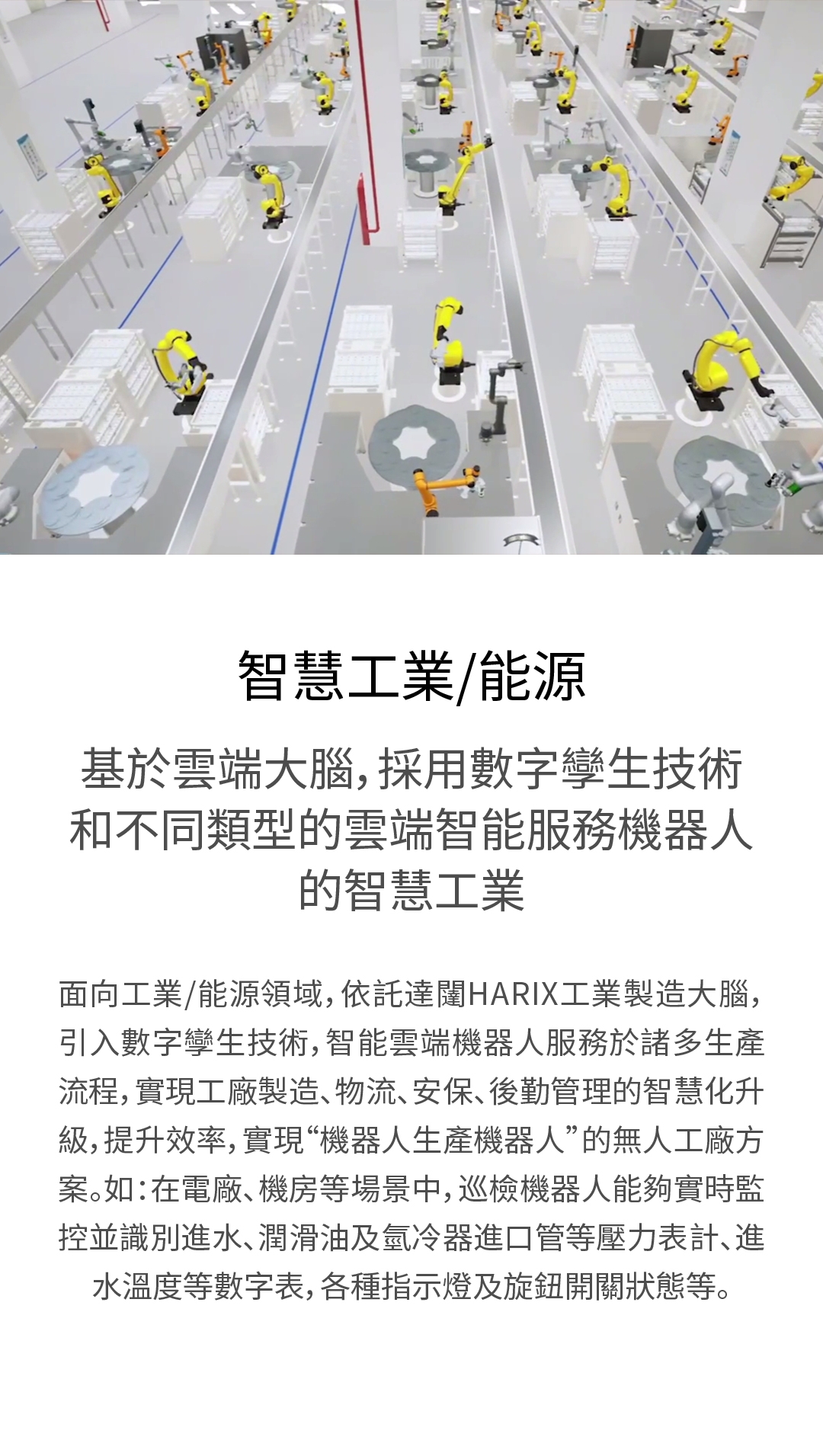 面向工業(yè)/能源領(lǐng)域,依託達闥HARIX工業(yè)製造大腦,引入數(shù)字孿生技術(shù),智能雲(yún)