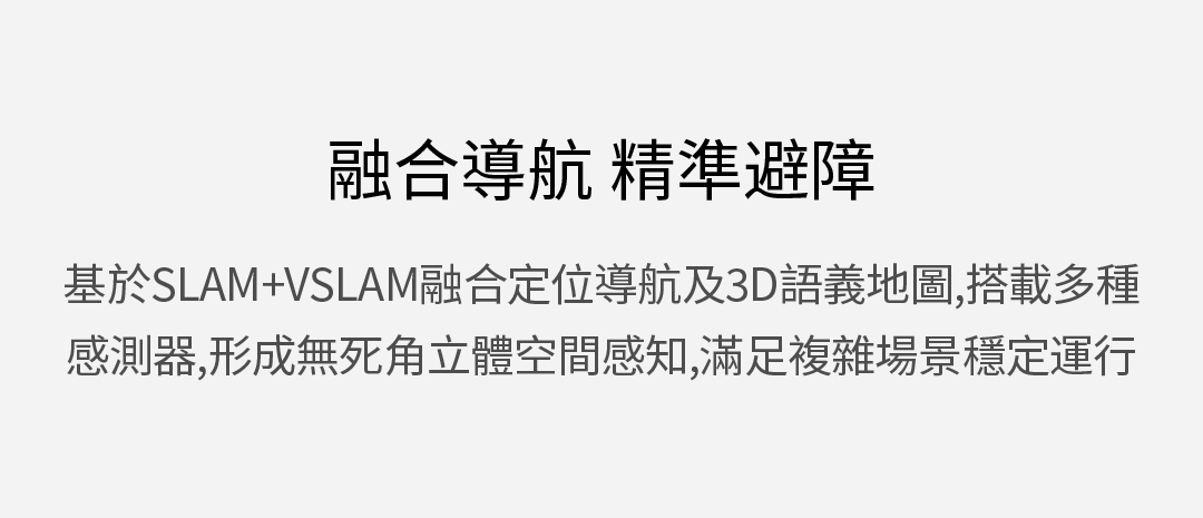 基於SLAM+VSLAM融合定位導(dǎo)航及3D語義地圖,搭載多種感測器,形成無死角立體空間感知,滿足複雜場景穩(wěn)定運行