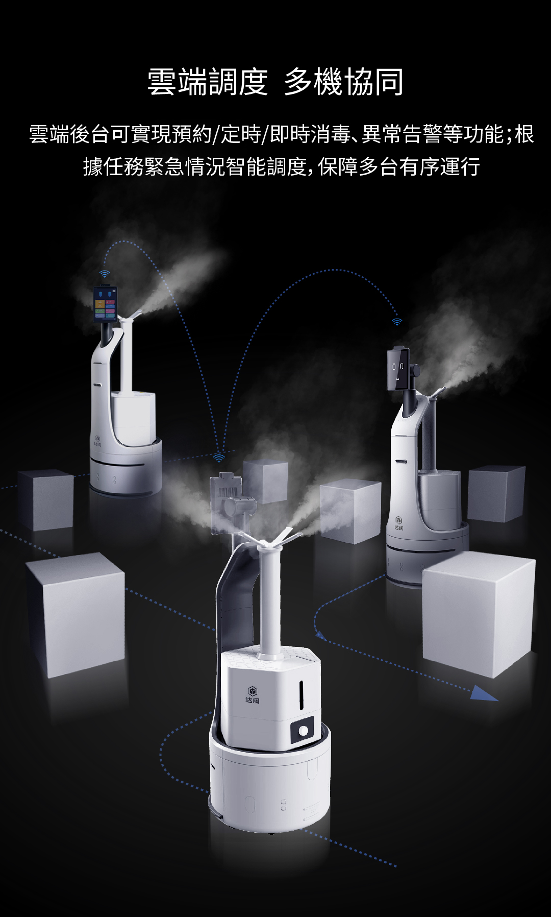 雲(yún)端後臺可實現(xiàn)預(yù)約/定時/即時消毒、異常告警等功能;根據(jù)任務(wù)緊急情況智能調(diào)度,保障多臺有序運行