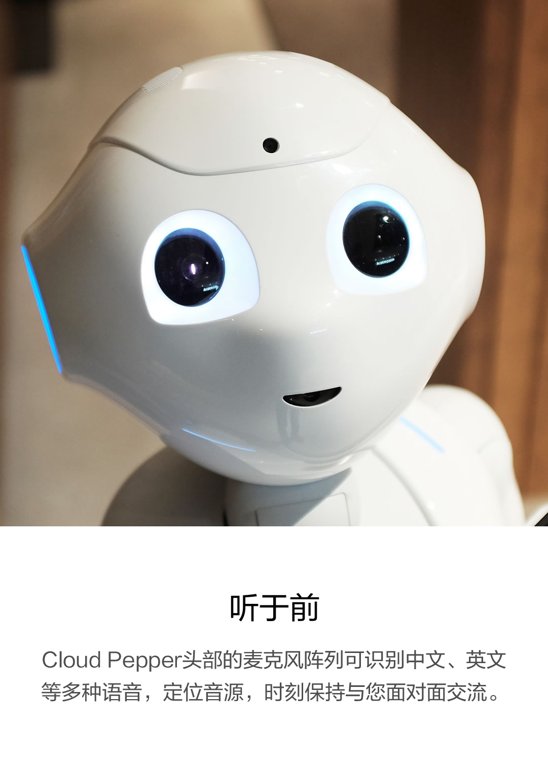 Cloud Pepper頭部的麥克風(fēng)陣列可識(shí)別中文、英文等多種語(yǔ)音,定位音源,時(shí)刻