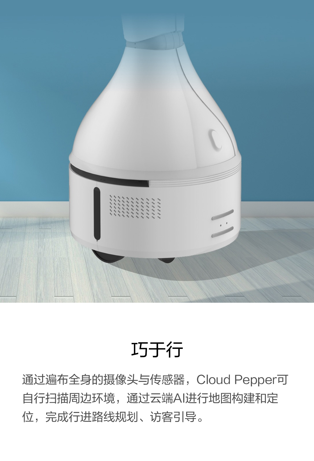 通過(guò)遍布全身的攝像頭與傳感器,Cloud Pepper可自行掃描周邊環(huán)境,通過(guò)云端