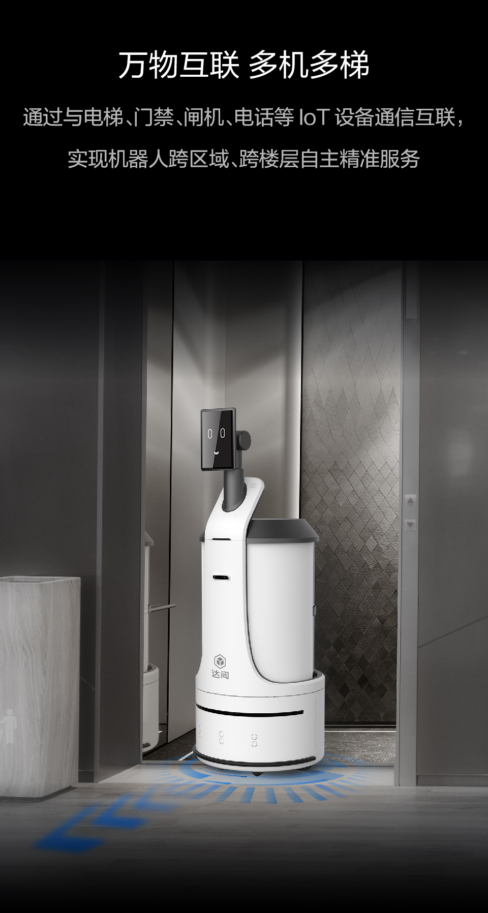通過與電梯、門禁、閘機(jī)、電話等IoT設(shè)備通信互聯(lián),實(shí)現(xiàn)機(jī)器人跨區(qū)域、跨樓層自主精準(zhǔn)服務(wù)